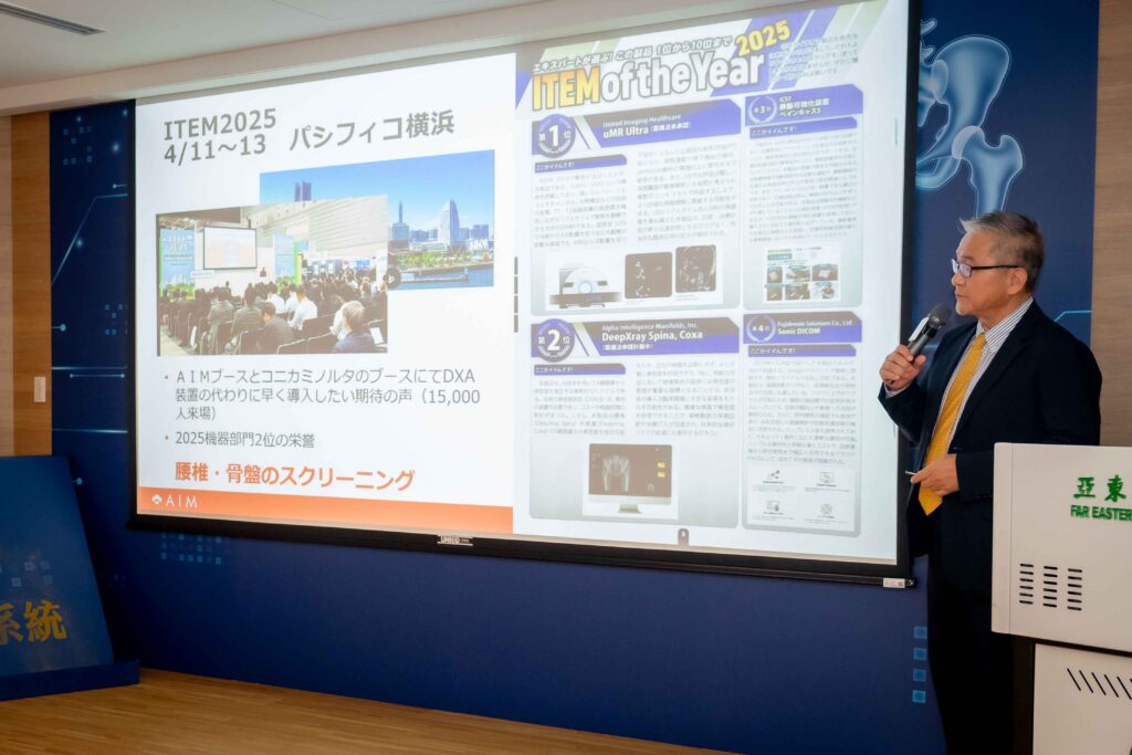此次發表會邀請AIM Japan 株式会社松本健一先生出席,分享日本在AI骨鬆偵測的臨床應用與政策經驗。他指出,日本政府已將骨鬆篩檢納入國家健康政策,目標2032年前將篩檢率從5.5%提升至15%。DeepXray™技術已於日本骨質疏鬆症學會發表,其腰椎與髖部影像分析與DXA結果高度一致(相關係數0.901),被公認為早期診斷與骨折風險預測的高效工具。