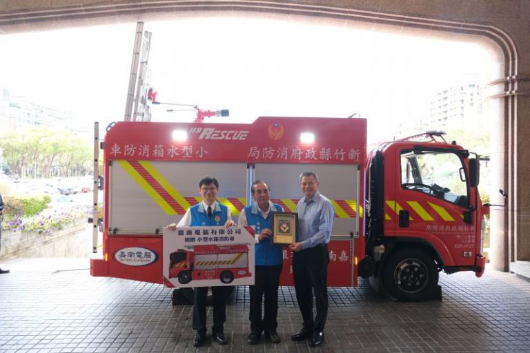 新竹縣竹北在地企業「嘉南電腦」熱心公益,今年再次斥資450萬元捐贈一輛小型水箱消防車,今(31日)於縣府大廳舉辦捐贈啟用典禮,副縣長徐元棟感謝嘉南電腦公司添購消防車輛贈予消防局第一大隊高鐵分隊,讓消防救災工作增添新利器,民眾生命財產更有保障。