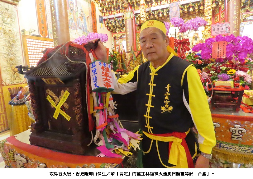 「奉旨」負責「挑香擔」的值年爐主林福祥,在法師完成請火把香火放入爐內後,隨即率先離開營區,以最快的速度在大約十五分鐘內將香火送回青雲宮內等待後續的「合爐」儀式。