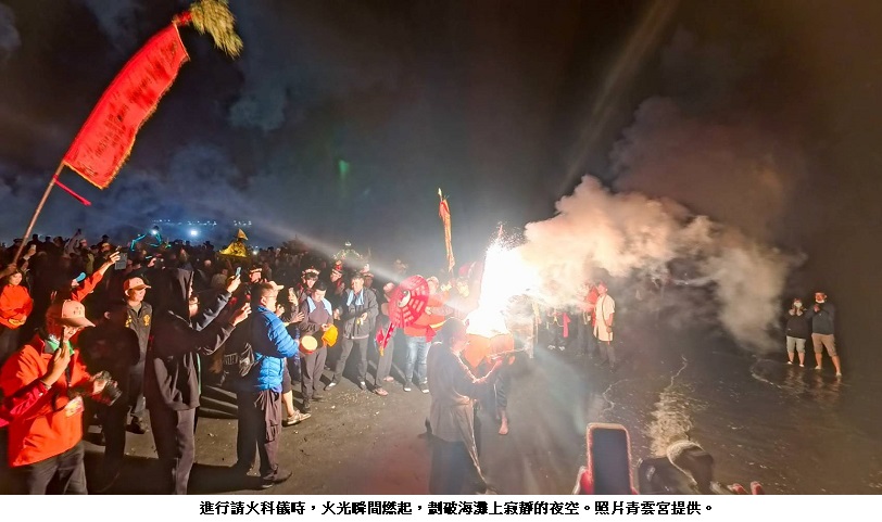 襄贊神威的友宮神轎及神尊,可能太嗨了,在海灘上「衝進衝出」,廟方怕影響到軍區內的作息,不停的喊著「歡喜就好,放卡輕駕」。「請火」是整個科儀的壓軸,火光在法師施法下瞬間燃起,劃破海灘上寂靜的夜空,場面震撼。