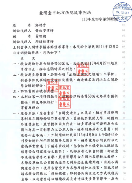 報新聞/中部特派員鄒志中報導 台灣發明界的領軍人物、「台灣愛迪生」鄧鴻吉先生,針對先前捲入的家庭財務及名譽侵害事件,已獲司法體系的徹底平反。台中地方法院民事庭日前作出判決,認定其舅舅黃瑞穗散播的指控構成「名譽毀損」,裁定須賠償鄧鴻吉新台幣50萬元的精神慰撫金,並應在全國性主流媒體《聯合報》上刊登判決主文,以公開恢復其名譽。