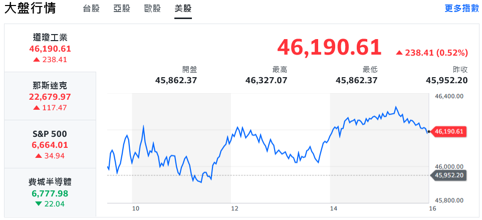 美國總統川普針對中國貿易政策最新談話態度放軟,加上區域銀行財報優於預期,暫時消除市場對其信貸風險的疑慮,美股上週五(17日)普遍收高,道瓊終場強彈238.37點、收46,190.61點;標普500漲幅0.53%、收6,664.01點;那斯達克勁揚117.44點、收22,679.97點;僅費半下跌0.32%、收6,777.98點。