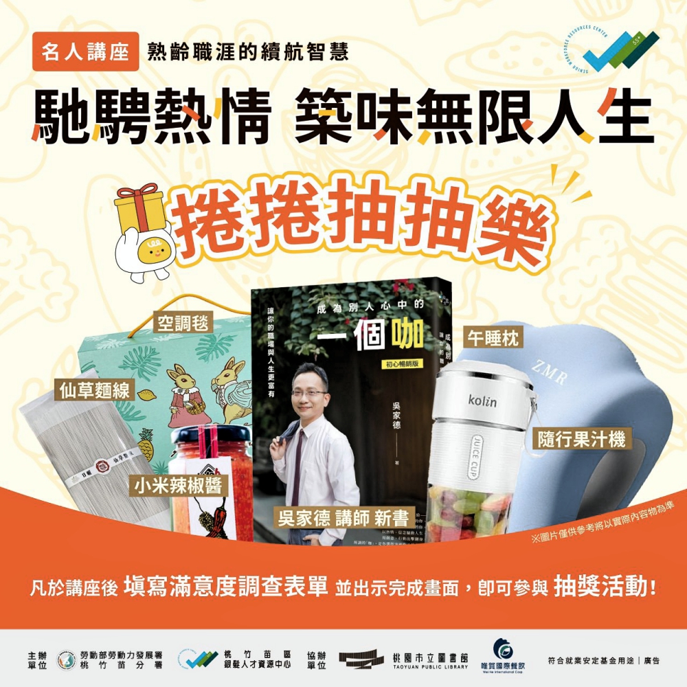 面對勞動市場與社會結構的轉變,如何激勵中高齡及高齡者延續職涯、重返職場,已成為當前重要課題。為協助中高齡及高齡者開拓職涯新方向、強化人際連結與社會參與,桃竹苗分署將於11月28日(星期五),在桃園市立圖書館總館一樓微光廳舉辦【職涯心指引:馳騁熱情.築味無限人生】名人講座,特別邀請唯賀國際餐飲集團吳家德總經理蒞臨分享,期望透過他的人生故事與經驗,啟發熟齡世代以行動續寫人生下半場的精彩篇章。