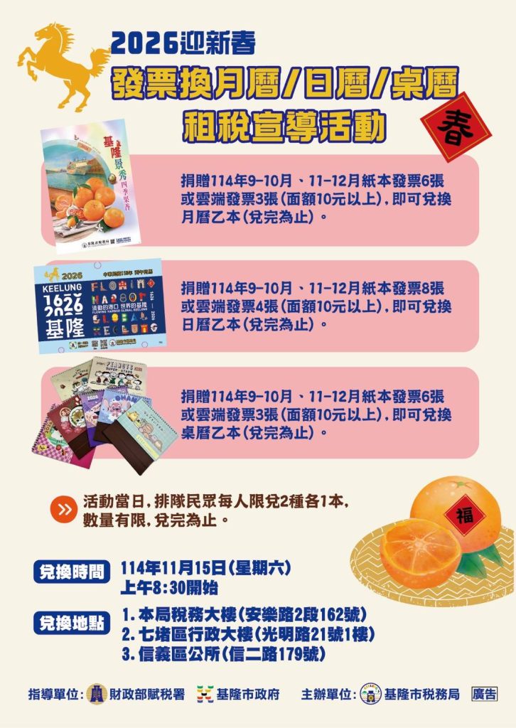 本次活動將於11月15日(六)上午8時30分起,在安樂區稅務大樓一樓、七堵區行政大樓一樓及信義區公所三處同步辦理。民眾捐出114年9月至12月期間紙本發票6張或雲端發票3張,即可兌換月曆或桌曆各1本;捐出紙本發票8張或雲端發票4張,則可兌換日曆1本。數量有限,兌完為止。每人限兌換三項品項中任兩項各1本,依現場排隊順序進行,若部分品項提前兌罄,則可改選其他項目。