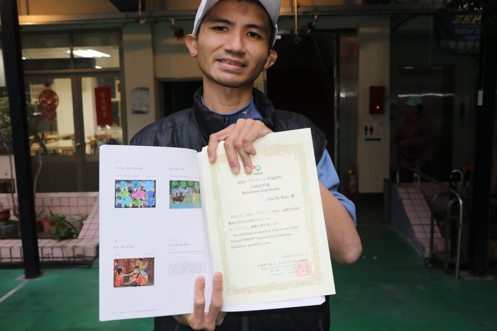 入住中和崇愛中心的呂俞賢是位心智障礙者,雖不擅言語表達,但透過畫筆抒發內心的孤獨世界和渴望,不僅連年獲得新北市「愛在畫中」優勝,也曾入選日本東京第9回國際交流展。由於他父親今年往生,母親年邁,且家中還有一位同為心智障礙的哥哥,僅依撿拾資收貼補家用。社會局媒合圓融行善團幫忙,圓融集資捐贈22萬元,呂俞賢回贈2025年作品「城市之王」,該幅作品還成為社會局年度桌曆的封面。