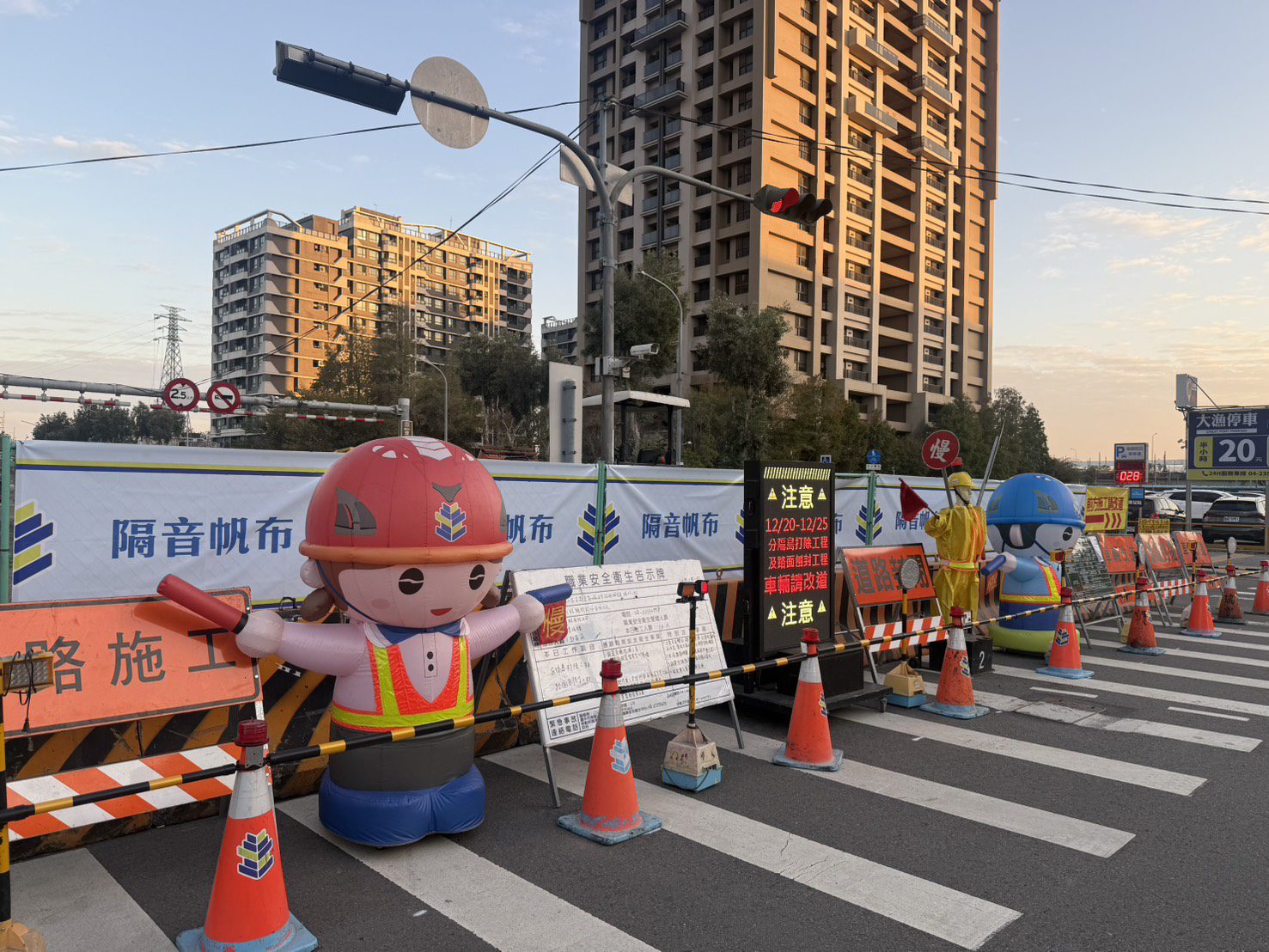 建設局表示,施工期間除加強各項交通維持作為,設置清楚的導引標誌外,並導入LED活動告示牌、大型卡通安保人員及隔音帆布等設施,提升行車辨識度並降低施工對周邊環境的影響;同時把握橋梁封閉期間,一併完成截水溝清淤、溝蓋鬆動固定及分隔島油漆等附屬作業,全面提升道路品質與排水效能。