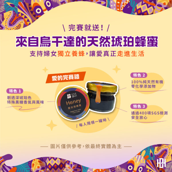 本屆最具故事意義的完賽物資—來自烏干達女性培力計畫的天然蜂蜜,象徵公益成果的具體化。蜂蜜源自當地女性透過養蜂技能培訓建立的自立產業,協助其逐步建立收入來源、改善家庭生活條件。