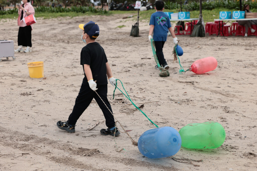 新北市府環保局「一一五年度春季聯合淨灘及淨溪活動」昨日在萬里區翡翠灣登場,參與的小朋友將漁業用浮球清除。 (新北環保局提供)
