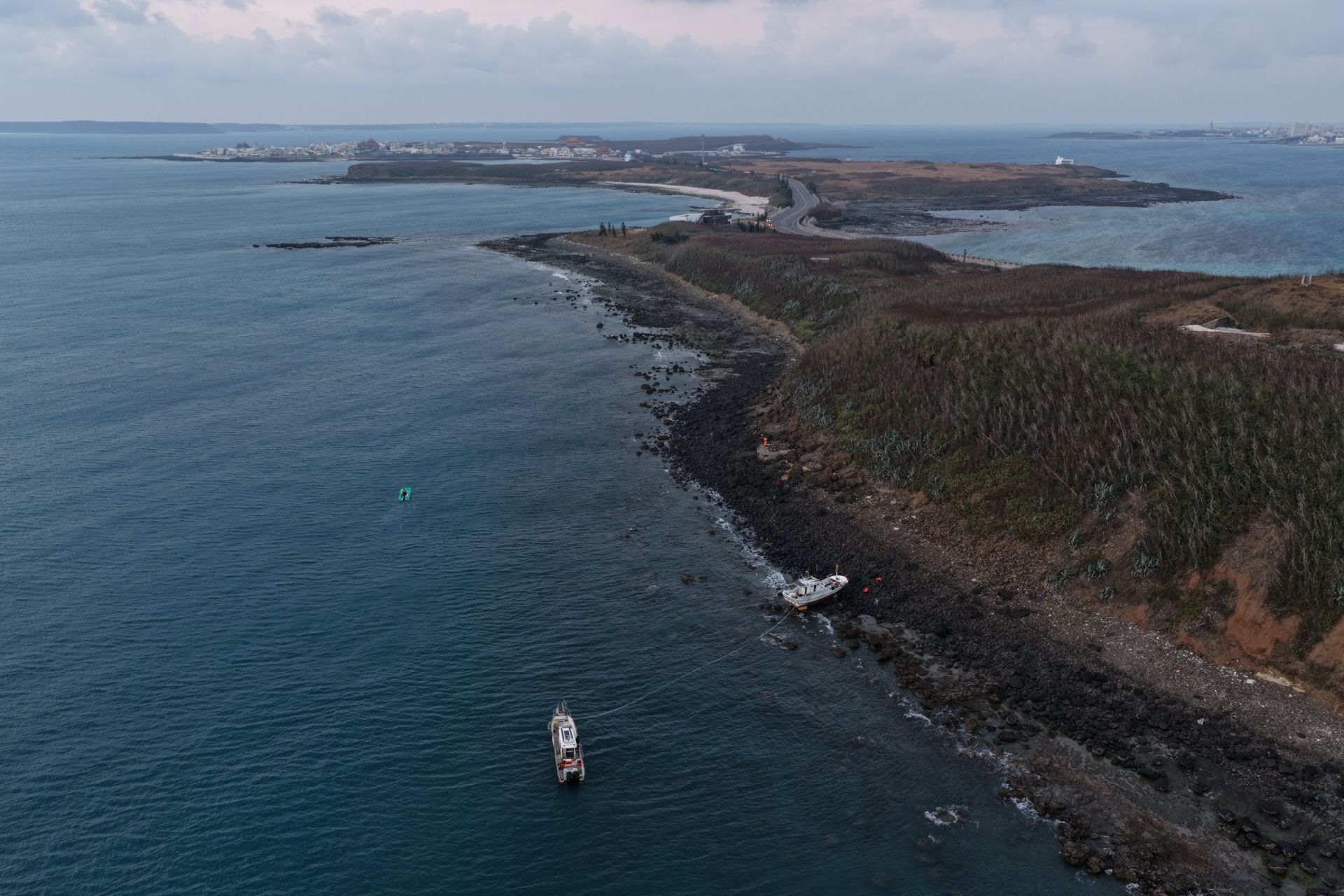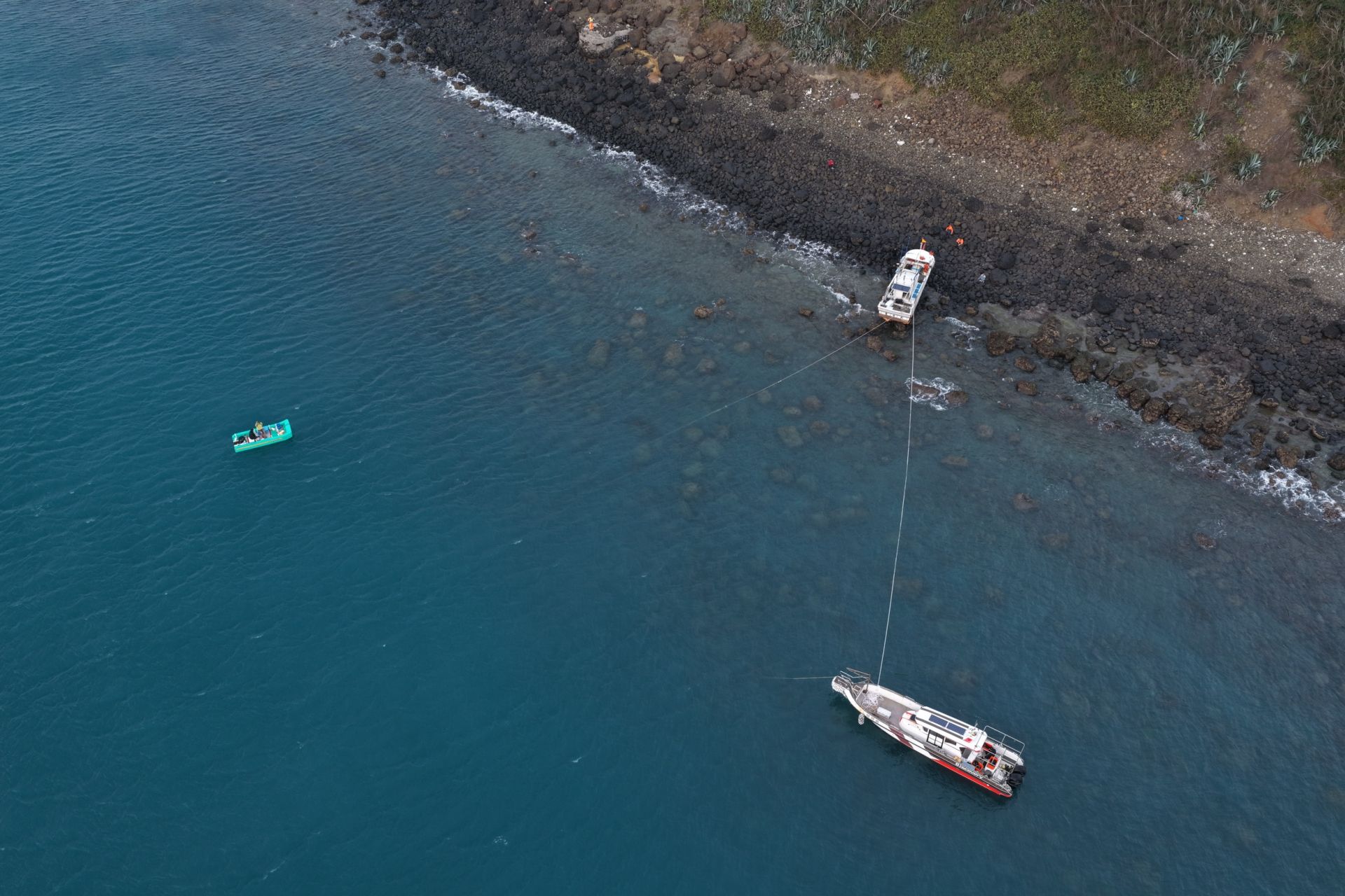 救難協會人員駕駛船艇到達事故海域後,立即著裝下水協助船體定錨,並於船底兩側架設保麗龍浮具防護後,後續將俟凌晨漲潮時段,再由其他船隻拖帶,期以協助脫困。