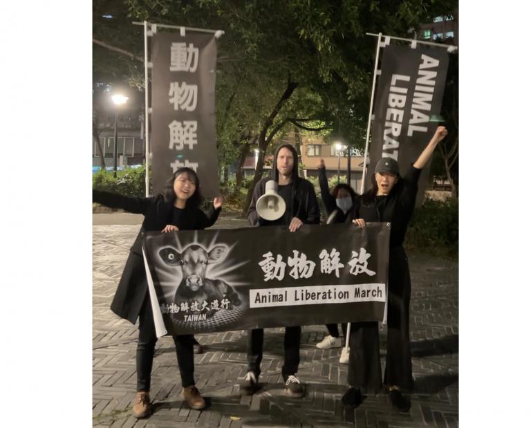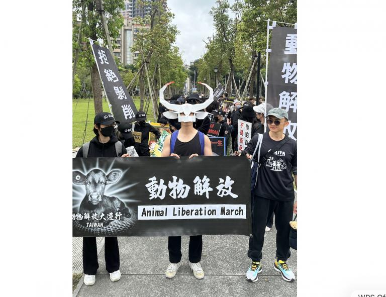 今(28)日下午,近百名動物權倡議者及民眾走上街頭,在百貨與餐廳林立的核心地段舉行「動物解放大遊行」,呼籲大眾重新思考日常消費與動物剝削之間的關係。長期支持動物解放的歌手Kimberley陳芳語、知名網紅「夠維根(GoVegan)」白龍,也將到場一起為動物而走。這場行動由致力於推廣動物權的團體「Animals’ Army 台灣動物解放軍」發起,參與者身穿黑衣、手持黑白寫實旗幟,由國父紀念館出發,行經信義計畫區與東區精華地段,透過「行動演說」與雙語口號,強調非人類動物是具備感知能力、應受尊重的生命個體,而非供人利用的商品或資源。