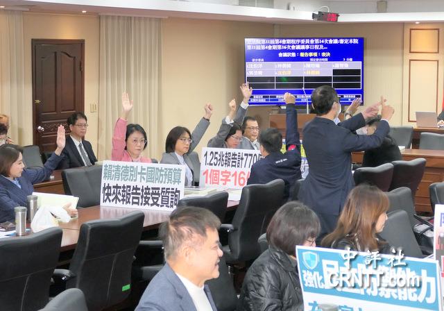 綜合報導/藍綠白30日又在立法院程序委員會展開攻防。民進黨籍立委沈伯洋提案要中國國民黨籍立法院長韓國瑜召開朝野協商,將國防特別條例交付審查。最後沈伯洋提案以反對者10人、贊成者8人的票數不通過;國民黨團提的國防特別條例暫緩案則以贊成者10人、反對者8人照案通過,這也是程序委員會第5度擋下國防特別預算。 會議開始,民進黨立法院黨團是由沈伯洋登記第一個上台發言,沈伯洋提出了“掛號說”,他認為程序委員會是法案掛號的地方,而法案一旦掛號了,就要進入到各個委員會去審查。他指責藍白是連審查都不給審查。他舉例像是去看醫生,拿出健保卡要掛號的時候,卻被要求要把詳細的病情全部列出來,沒有列出來的話不能夠掛號。 ![]() 國民黨團先是由黨籍立委林倩綺上台宣讀提案,黨籍立委羅智強登記第四個發言,他反擊民進黨、賴清德喪權辱國,不但丟失了“海峽中線”,連領海基線都受到威脅。他批評民進黨團上台是演戲、做戲,並問“請問你現在有辦法阻止中大陸機軍艦越過‘海峽中線’嗎?” 最後藍綠就各自提案進行表決,沈伯洋提案要立法院長韓國瑜召開朝野協商,將國防特別條例交付審查。國民黨團則是要將政院版財劃法、國防特別條例等案暫緩列案,並通過黨籍立委翁曉玲、陳玉珍等對總統罷免、公投法之修正提案。最後沈伯洋提案以贊成者8人、反對者10人的票數不通過;國民黨團提案則是贊成者10人、反對者8人照案通過,也是程序委員會第5度擋下國防特別預算。(中評社) |