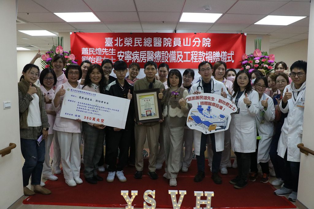 老家在宜蘭的蕭民煌先生與劉怡君女士,長期關注宜蘭偏鄉資源匱乏,秉持回饋社會、關懷弱勢與守護生命尊嚴的初心,提升宜蘭地區偏鄉安寧照護品質,於臺北榮民總醫院員山分院規劃設立安寧病房之際,慨然捐贈總價值新臺幣350萬元之設備與工程經費,協助本院順利完成安寧病房設立,造福在地病患。