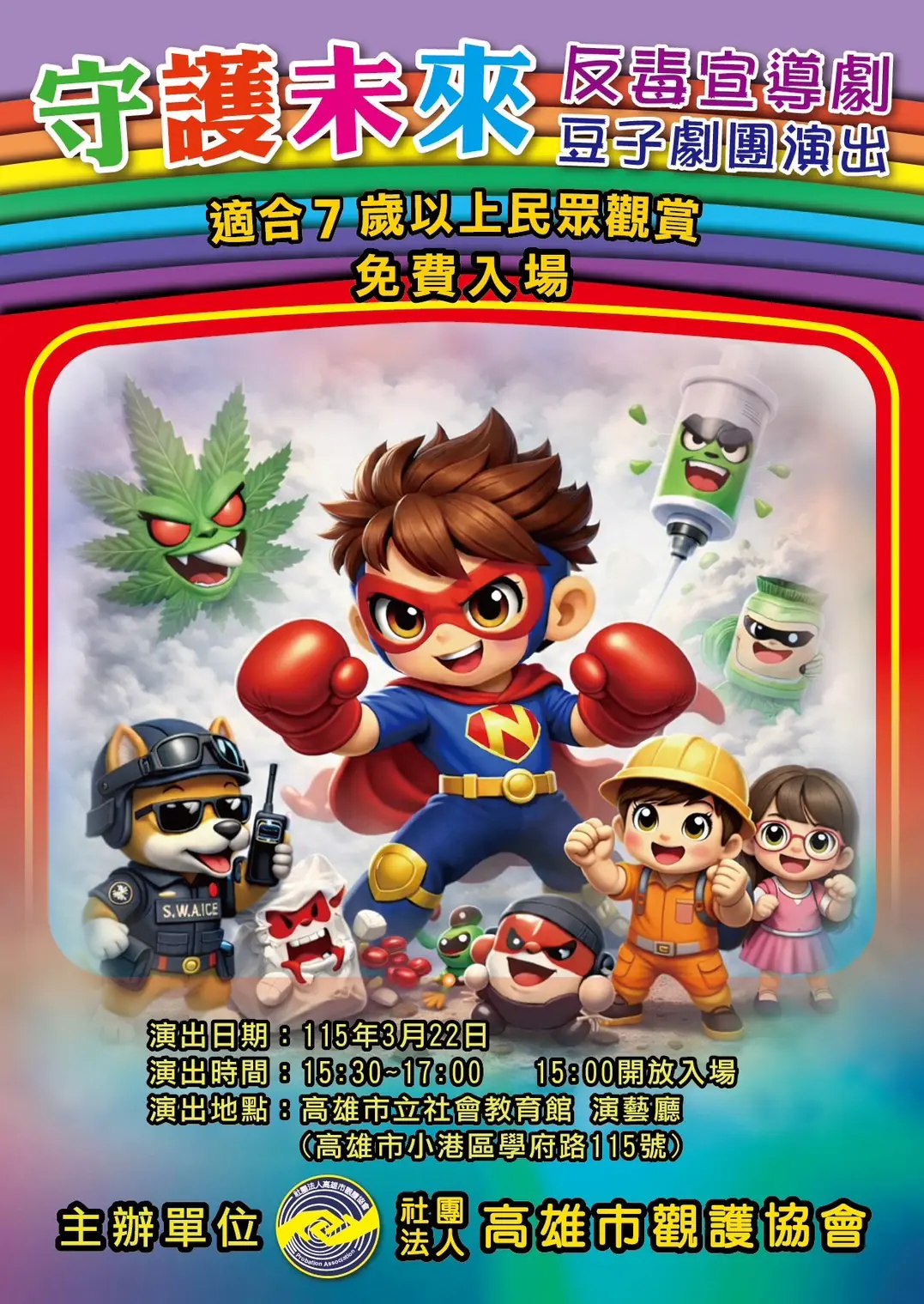 由社團法人高雄市觀護協會主辦的「守護未來—校園反毒宣導劇《鬼毒殺隊》」巡演啟航首場,於3月22日下午3時30分在高雄市立社會教育館演藝廳熱鬧登場。此次特別攜手深受親子喜愛的豆子劇團擔綱演出,並結合高雄市政府毒品防制局、高雄市政府警察局少年警察隊等單位共同宣導,現場氣氛熱烈,座無虛席,家長與孩子熱情參與,為今年反毒巡演揭開繽紛又有力量的序幕。