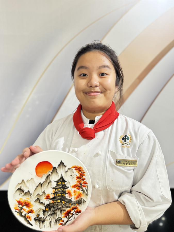 ▲國廚印尼籍羅賢麗巧手以果膠畫出山水意境贏得金牌。(圖/高餐大提供)