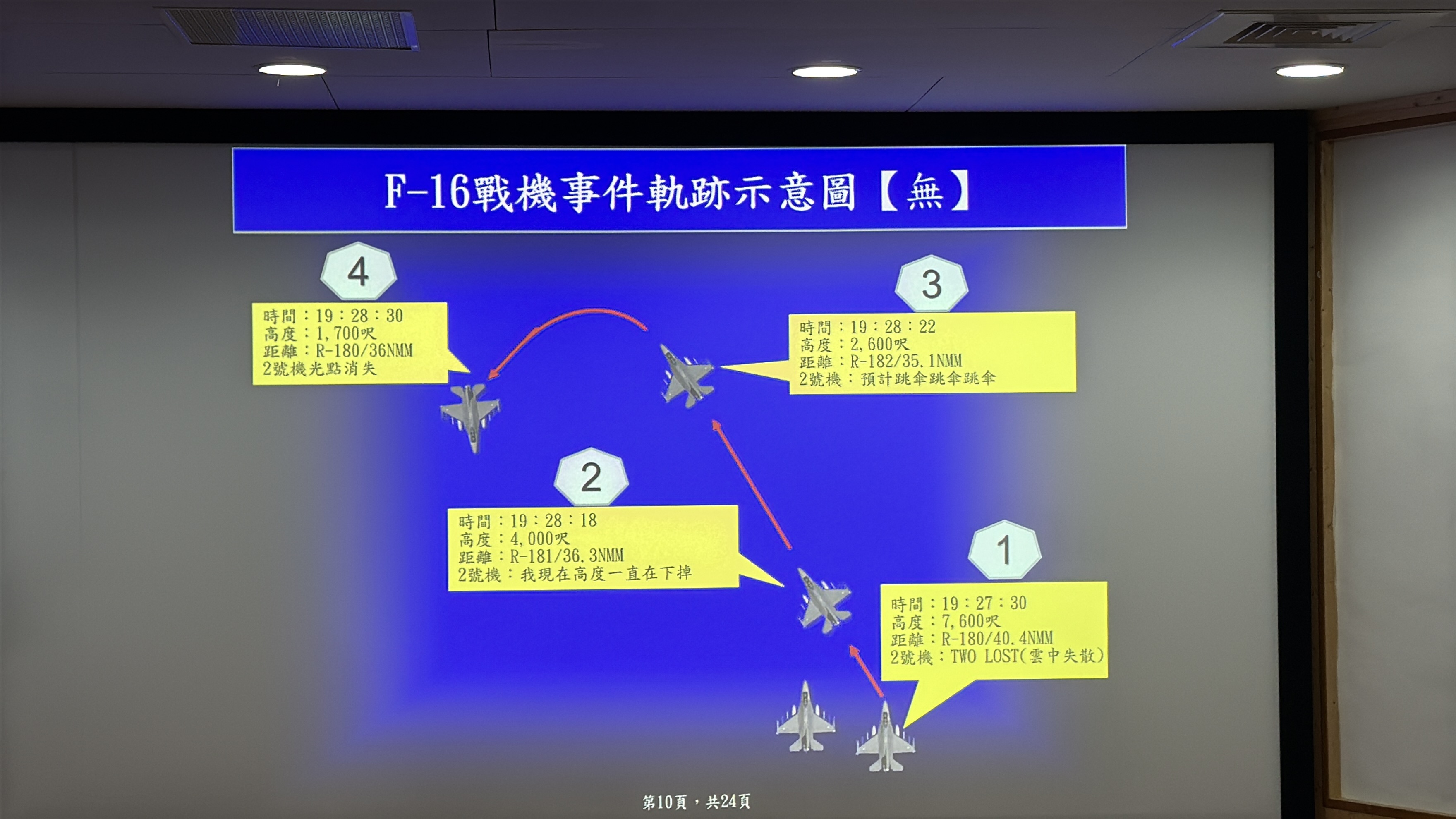 此外,根據軍方公布的軌跡數據,辛柏毅上尉在短短 12 秒內遭遇了急劇的高度下掉,尤其在 19 時 28 分 18 秒至 22 秒這關鍵 4 秒內,高度從 4,000 呎驟降 1,400 呎,顯示當時情況極度兇險。周明慶隊長指出,辛柏毅當時已察覺遭遇「空間迷向」,並在極大壓力下試圖執行保持飛機操作等緊急處置原則。