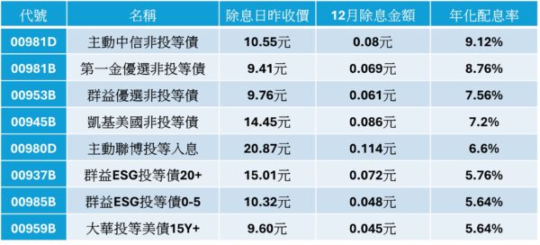 00981D於12月首度除息金額為0.08 元,以除息前一日收盤價10.55元計算,年化配息率高達9.12%,強勢登上12月債券ETF「配息王」,不僅在主動債ETF中獨占鰲頭,配息率也優於眾多熱門的被動債ETF。目前市面上非投等與投等債ETF,年化配息率普遍落在5.6%至 6.6%之間。00981D以突破9%的高水準,對追求現金流的投資人而言,具備難以抗拒的吸引力。