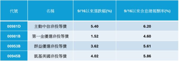 不僅如此,在績效上面,00981D表現也名列前茅。根據彭博統計,00981D自9月中掛牌以來,含息總報酬約為6.2%,與規模較大的幾檔非投等債ETF相比,績效依舊領先,這也凸顯出主動操作的優勢,能根據市況立即作出反應,掌握機會賺取資本利得。