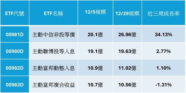 根據CMoney資料顯示,近三周(12月5日至12月29日)來,其規模由20.1億元躍升至26.96億元,成長幅度逾34%,在同類商品中明顯領先。顯示在主動債ETF戰場上,00981D已率先突圍,成為資金配置的首選。