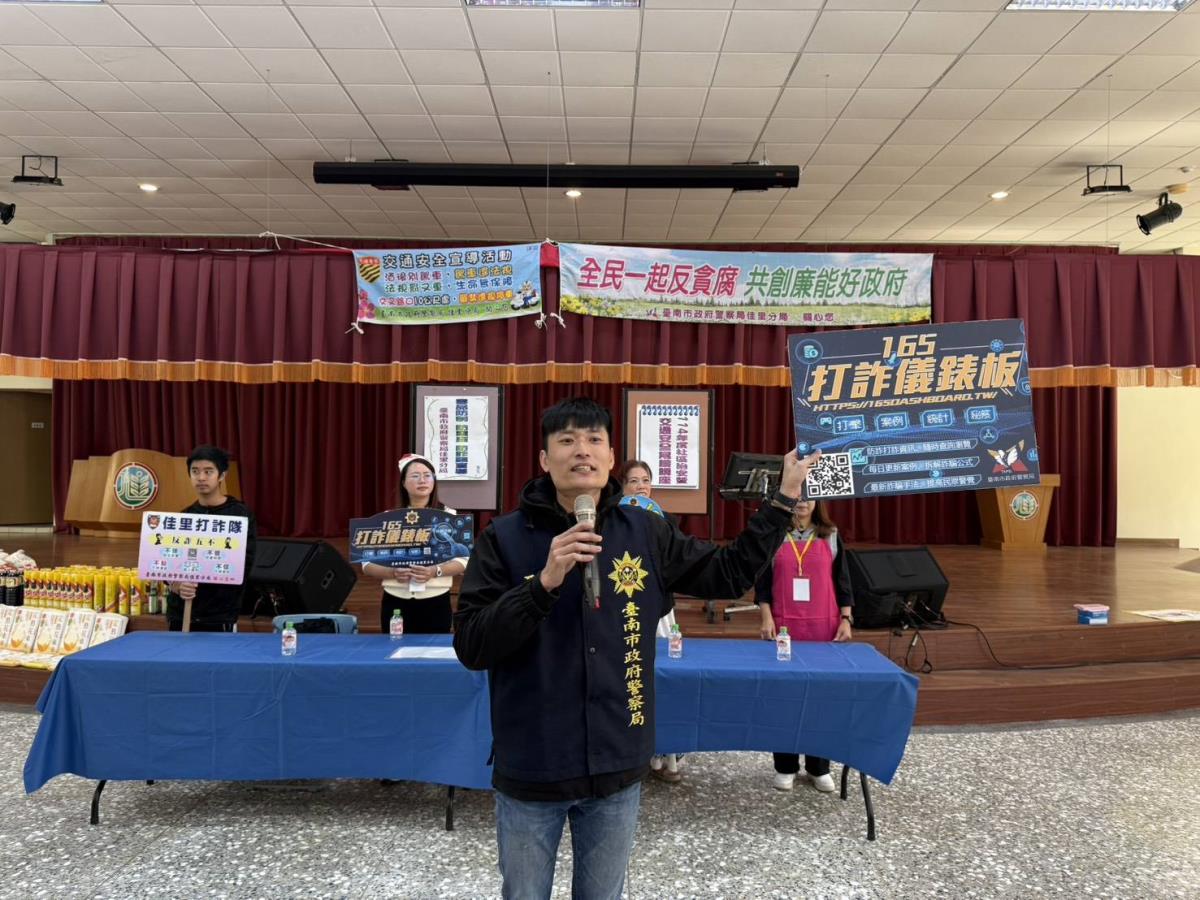 台南市政府警察局路老師李晟邦警官及政風室業務宣導陳科員與佳里分局巡佐許智惠於現場宣導動保、環保犯罪案例及防疫安全的重要性與反貪腐廉政倫理現行工作重點及未來廉政政策的走向、強化宣導四大反詐騙求證重點事項如下: