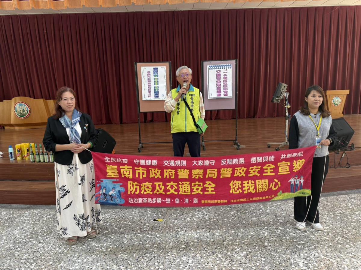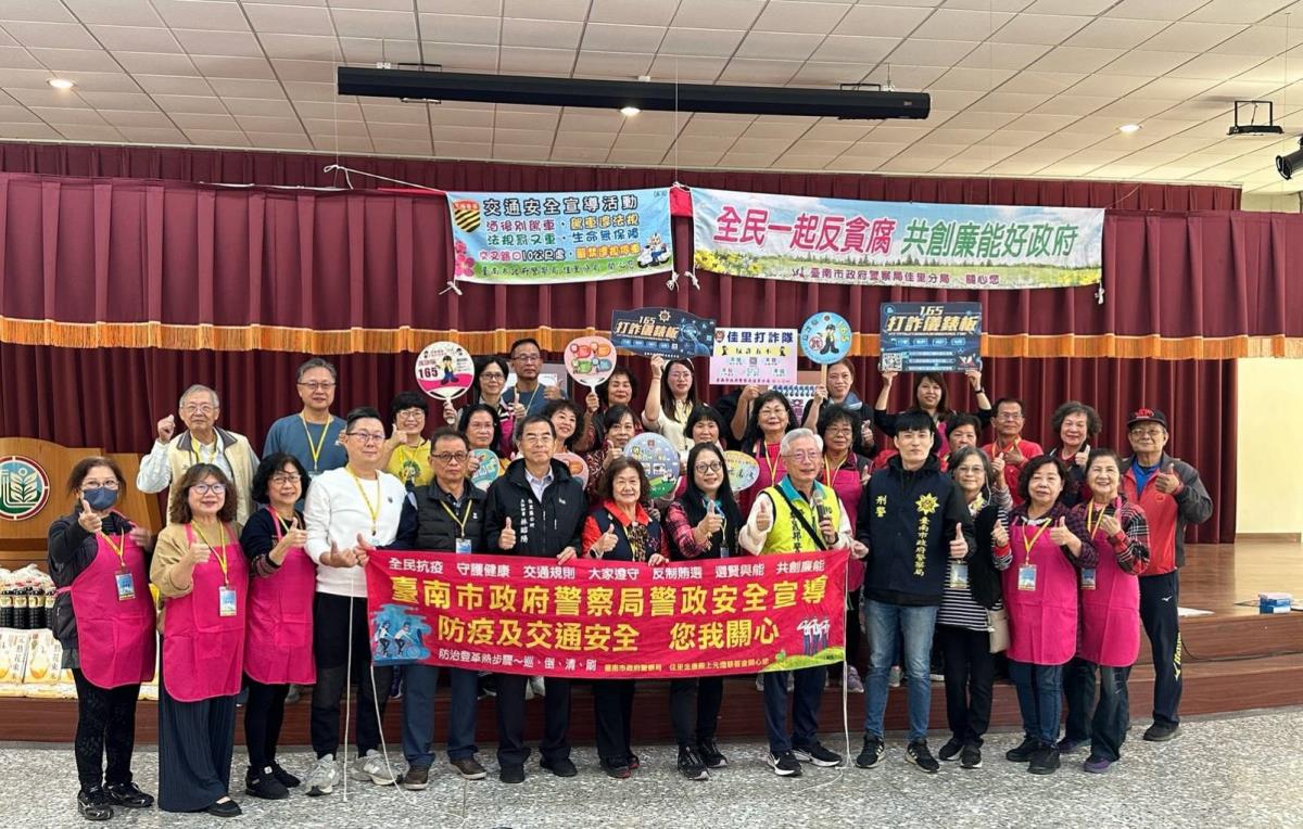佳里警分局偵查佐吳哲維及佳里派出所警員劉弈彣與現場長輩分享反詐騙及交通安全常識之工作心得,避免財物損失及交通事故一定要牢記防詐騙三步驟及遵守交通規則,1聽,2掛,3查證,如此才能守護個人財產安全,及避免詐騙集團與交通事故的危害,互動熱絡,場面溫馨。