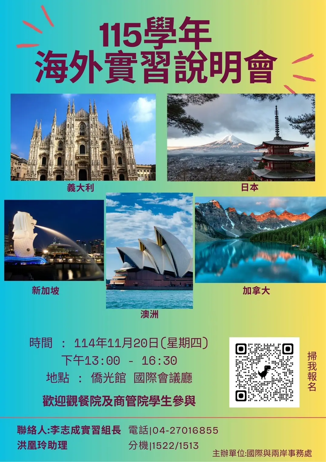 為拓展學生國際視野,提升跨文化職場能力,僑光科技大學國際與兩岸事務處舉辦「115 學年海外實習說明會」,向同學介紹義大利、日本、新加坡、澳洲、加拿大等國的海外實習機會。本次活動於僑光館國際會議廳舉行,由實習組李志成組長與來自海外廠商親臨分享,吸引觀光餐旅學院與商業管理學院學生熱烈參加。
