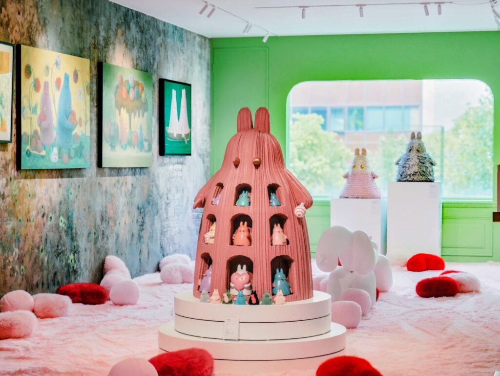 四樓透過異材質與色彩構築高度沉浸的感官經驗。中國藝術家 林天祿 以「花妖」、「絨花」與 「MoMo兔」系列,將童趣轉化為一種柔軟的心理空間;台灣新銳油畫家 林煌彥 以獵豹為核心意象,回應孤獨、自我凝視與存在狀態。五樓則展出美國當代藝術家 Daniel Arsham 的多件稀有雕塑作品,以「未來考古」概念,透過侵蝕與晶化的形式,使作品游移於遺跡與未來之間,為五層樓的藝術空間延伸出關於文明與記憶的無限思考。