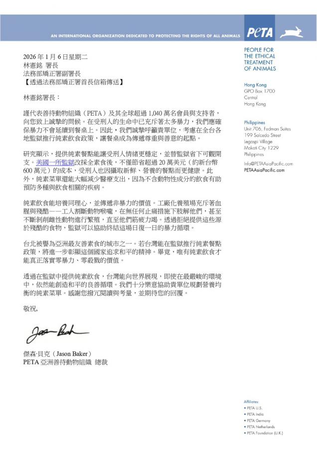 善待動物組織(PETA)於1月6日致函法務部矯正署署長,誠摯呼籲矯正署在新的一年在全台監獄推行純素餐點政策。PETA 指出,國際研究顯示提供純素飲食不僅能穩定受刑人情緒、節省公帑開支,更能有效培養同理心與傳遞非暴力價值。