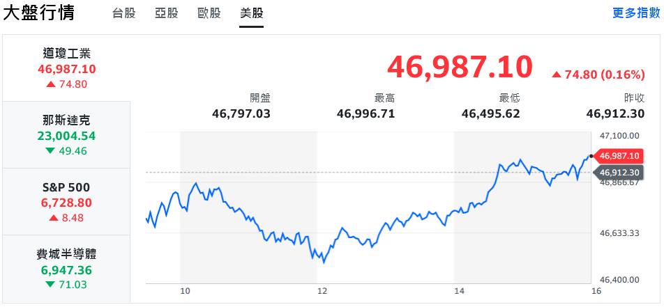 受美國經濟疑慮與AI科技股高估值影響,美股上週五(7日)漲跌互見,道瓊終場上漲74.80點、收46,987.10點;標普500漲幅0.13%、收6,728.80點;那斯達克下跌49.46點、收23,004.54點;費半收低1.01%、來到6,947.36點,多數機構認為這波修正屬正常波動,市場基本面仍穩健。