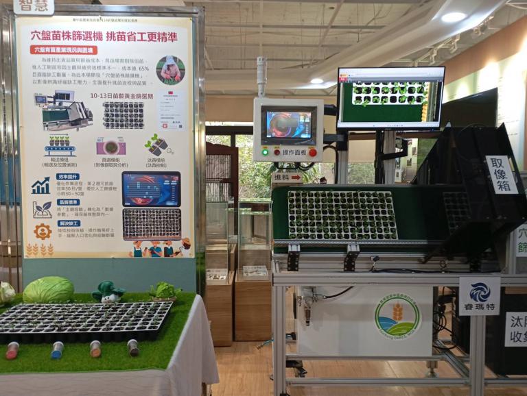 「智慧:穴盤苗株篩選機」:育苗場每日需處理大量穴盤苗,傳統人工挑苗作業耗時費力,且易因人員疲勞或經驗差異,影響出貨品質一致性,成為育苗產業長期缺工痛點。為回應產業需求,研發「穴盤苗株篩選機」,導入影像辨識與自動化控制技術,提升育苗作業效率與品質穩定度。系統鎖定苗齡10至13天之穴盤苗,透過影像辨識即時判讀苗株生長狀態,自動剔除缺株與弱勢苗,並結合PLC控制,將作業流程優化為連續輸送。以128孔穴盤為例,每盤僅需30秒即可完成篩選,平均較人工目視篩選效率快3倍,辨識準確率達97%以上,及可提早1週作業。這項技術成功將過往仰賴師傅經驗的人工判斷,轉化為可複製的數位參數,確保出貨苗株整齊均一,提升商品價值。目前已應用於青花菜及甘藍育苗,後續將拓展至花卉場域,並已取得新型專利及與業者簽訂技術移轉,助攻產業智慧化升級。