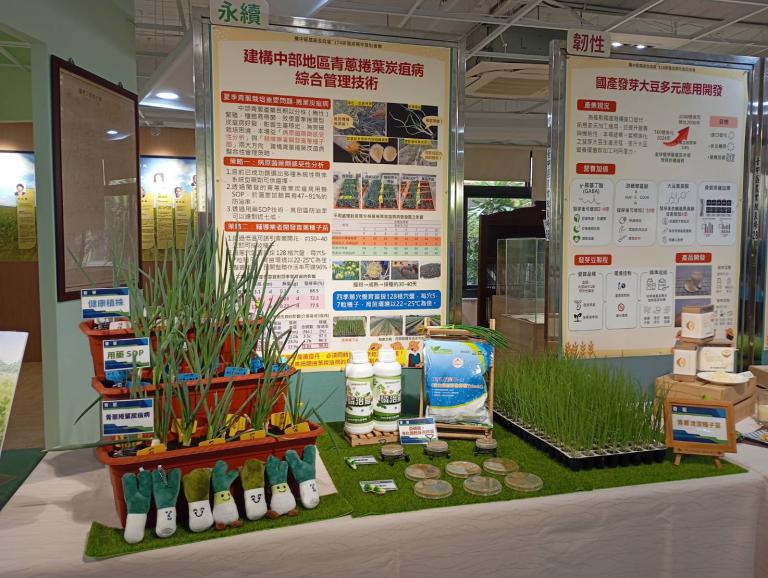 「永續:建構中部地區青蔥捲葉炭疽病綜合管理技術」:中部青蔥產業長期以分株(無性)繁殖為主,種苗易帶菌,致使夏季捲葉型炭疽病頻繁發生,影響生產穩定。為突破栽培瓶頸,台中場從「病原菌藥劑感受性分析」及「輔導業者開發青蔥種子苗」兩大方向,建構青蔥捲葉炭疽病整合性管理策略。在病害防治方面,篩選出嘉賜銅與四氯異苯腈等保護型藥劑,以及多保鏈黴素、賽普護汰寧與普克利等系統性藥劑,證實可有效延緩捲葉炭疽病病勢發展。同時,建立「128格穴盤、每穴5-7粒播種及整叢移植」之標準化育苗技術,苗株存活率達96%以上,為國內青蔥種苗體系建立新模式,生長勢與抗逆境能力均明顯優於傳統單株移植。藉由建立科學化用藥模式,以保護型藥劑守護清潔種苗,並搭配系統性藥劑阻隔外來病原入侵,成功將田間捲葉炭疽病發病率降低至5-8%。