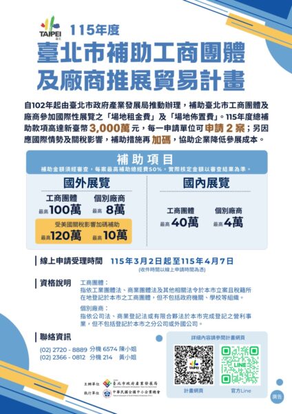 115年度補助國外展覽以及於臺灣舉辦之國際性展覽(可至經濟部國際貿易署全球展覽資料庫查詢)。計畫總補助款項高達新臺幣3,000萬元,並提高補助額度;每一申請單位可申請2案。另因應國際情勢及關稅影響,本年度亦辦理補助加碼措施,協助企業降低拓銷成本、強化國際競爭力。線上申請期間115年度自3月2日起至4月7日止,計畫說明會將於3月16日辦理,歡迎有興趣之臺北市工商團體及個別廠商踴躍申請。