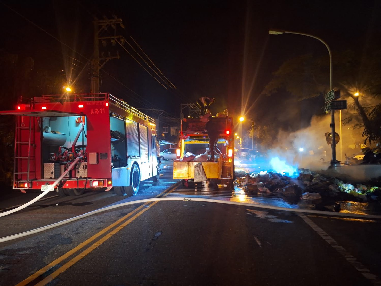 消防隊員朝起火垃圾車射水灌救。翻攝畫面