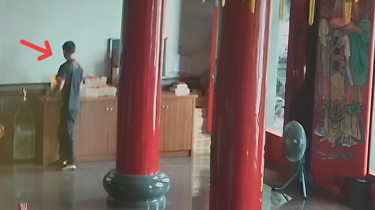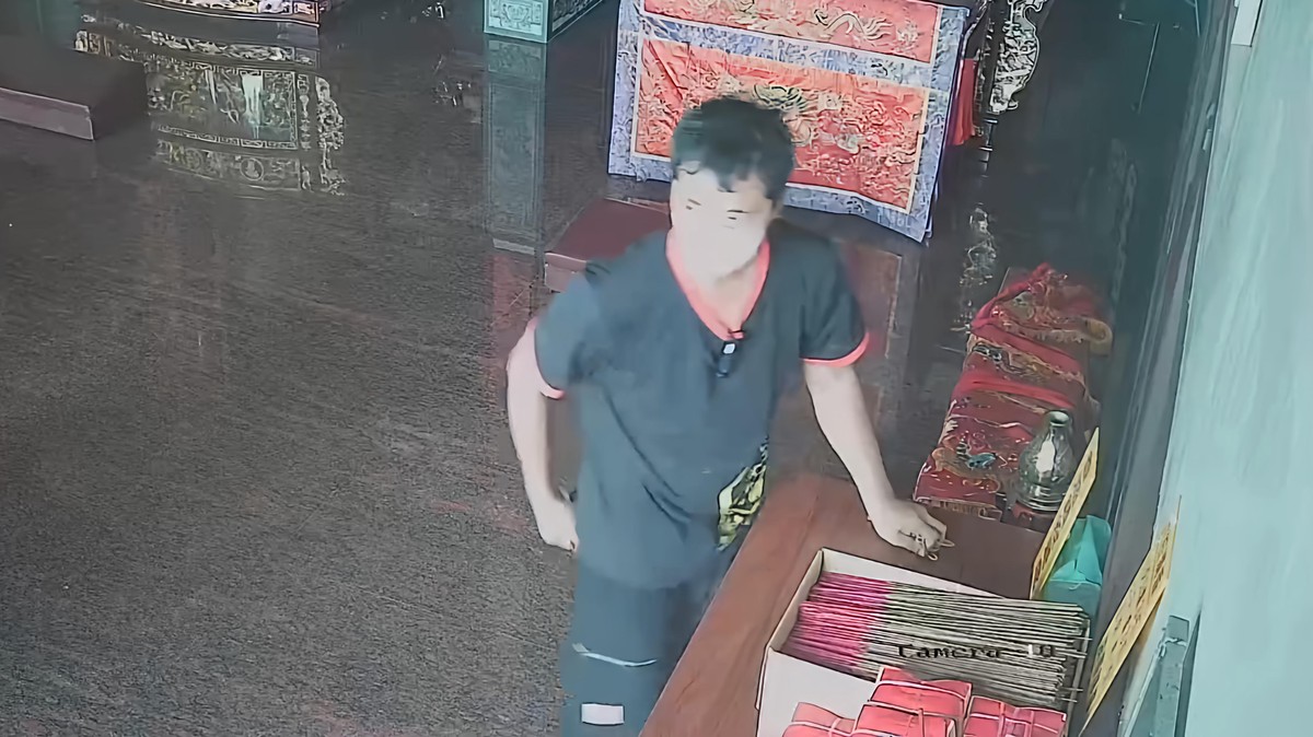 屏東縣九如鄉耆老村寶帥宮日前舉辦平安祈福宴,吸引村民踴躍參與場面熱鬧。不料活動結束後隔天,廟方清點香油錢時卻發現金額短少,調閱監視器驚見一名約40多歲男子光天化日四下無人時潛入廟內,手持釣線綁上黏性物質伸入功德箱內,偷取香油錢,行徑相當狡猾。